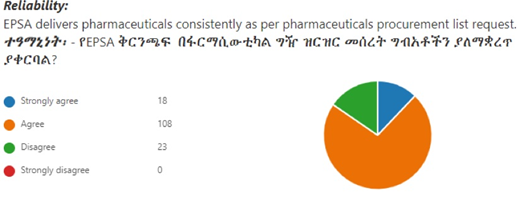 In addition, EPSS and GHSC-PSM have developed a web-based customer satisfaction and feedback collection system (link in Box I) to obtain real-time feedback immediately after customers get service at the EPSS hubs. The system uses a self-administered online data collection system created with Microsoft Office Forms both in Amharic and English. All customers receive the URL for the customer satisfaction survey questionnaire that can be accessed through their phone or computer browser. The web-based system contains a total of 11 Likert-type scale questions to rate the EPSS accessibility, capability to avail pharmaceutical with fair price, reliability, responsiveness, and flexibility to meet customers’ demand. The system also has an online reporting dashboard showing a summary and visuals of the results for each of the 17 questions. Raw data from each hub are exported to SPSS software for further analysis, but national aggregated results are currently unavailable.